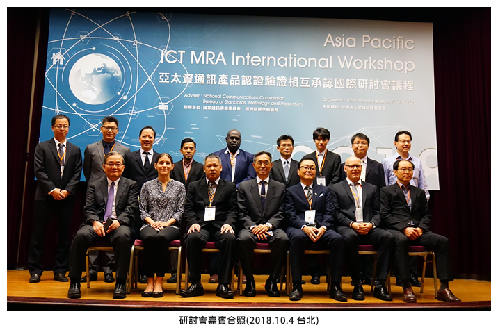 資訊與通訊產業於我國產業發展占有重要地位,TAF為協助國內ICT產業及檢測、驗證業者,瞭解各國主管機關對於ICT產品認(驗)證的要求與相關技術法規,利用各國主管機關代表於2018年10月間參加由我國國家通訊傳播委員會主辦亞太經濟合作會議(APEC)電信暨資訊工作小組第58次會議(簡稱APEC TEL 58),齊聚台北之際,特於2018年10月4日舉辦「亞太資通訊產品認證驗證相互承認國際研討會」,邀請包括美、日、加拿大等國代表分享其等國家的資通訊法規,國內包括有來自主管機關、資通訊業者、測試實驗室與驗證機構共121位代表參加。