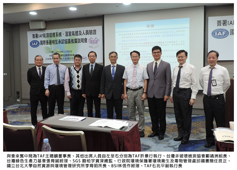 「一次認證,全球接受」,本會簽署IAF能源管理系統(EnMS)、溫室氣體(GHG)及人員驗證國際多邊相互承認協議(MLA),邁向國際接軌新里程。本會於2018年11月8日上午10:00假台大國際會議中心辦理「簽署IAF能源管理系統(EnMS)、溫室氣體(GHG)及人員驗證國際多邊相互承認協議(MLA)推廣說明會」,由本會王董事長聰麟開場致歡迎詞,說明本會努力建置與國際接軌之認證平台,完成了多項領域IAF MLA之簽署,代表本會認證通過之驗證機構之能力具有國際級的水準,可提供權責機關與企業足以信賴之驗證結果,另外企業也透過標準、規範及符合性評鑑方法皆一致之基準下,通過之驗證被世界各地認可。
