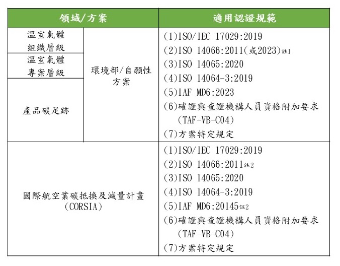 註2 ICAO CORSIA方案目前僅適用ISO 14066:2011年版及IAF MD6:2014年版。