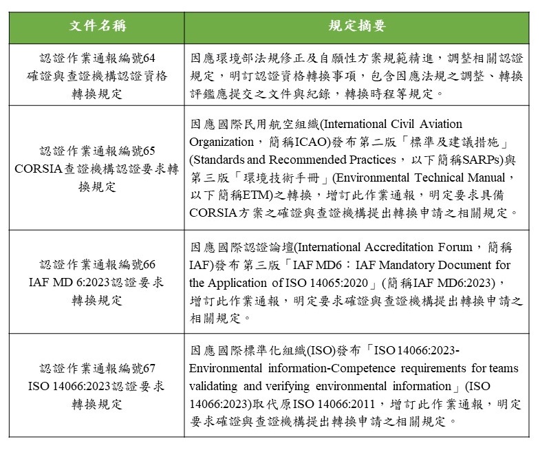 註1 ISO 14066刻正轉版中(2011轉至2023年版),確證與查證機構應於2025年4月30日前向本會申請資格異動。(詳請參閱「認證作業通報#67」)。